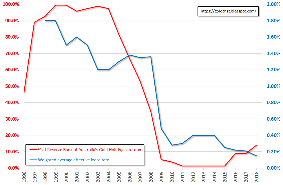 Having said that, the 0.15% in my opinion is too low notwithstanding the RBA is lending on a collaterised basis or to entities with "government support". The red line on the previous chart shows that the RBA was pretty much lending out all of Australia's gold reserves prior to 2005 but sharply pulled out of the market as its longer term (1-5yr duration) leases matured (see this post for charts on the RBA's gold lease duration mix) into a market where lease rates were sub 0.40%. It clearly didn't think the risk/return tradeoff was right at the time and that was prescient considering the GFC hit in 2008. If the RBA is willing to increase its gold leases at 0.15% it must now consider everything has been fixed and financial risks are low!
