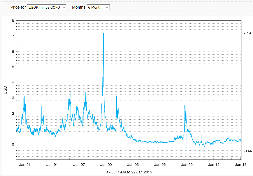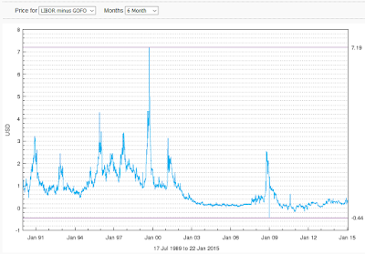 While 0.15% or even 0.40% may seem low to those outside of the bullion markets, they are reflective of gold lease rates in general, which are available here. The chart below is from that link and shows the derived (ie LIBOR - GOFO) gold lease rate for a lease of 6 months duration (note that the chart stops in 2015 as GOFO benchmarks ceased that year and full lease rate data is only available on paid subscription sites with some derived data being produced by Monetary Metals for free if you sign up).